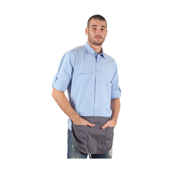 Ποδιά σερβιτόρου κοντή. Δέσιμο με κορδόνια μέση. Δύο μπροστινές τσέπες και μια για στυλό. Διάσταση 48 x 33cm.