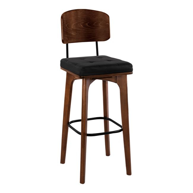 Το σκαμπό είναι κατασκευασμένο από ξύλινο σκελετό σε χρώμα καρυδιάς και μαξιλάρι από τεχνόδερμα σε μαύρη απόχρωση. Διαστάσεις: 38x45x113 εκ. Ύψος καθίσματος: 78 εκ.