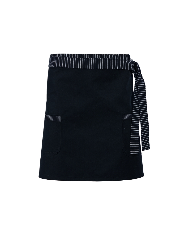 Ποδιά μέσης ΑΧΟΝ μαύρη με ριγέ ζωνάρι δύο τσέπες δεξιά και αριστερά.