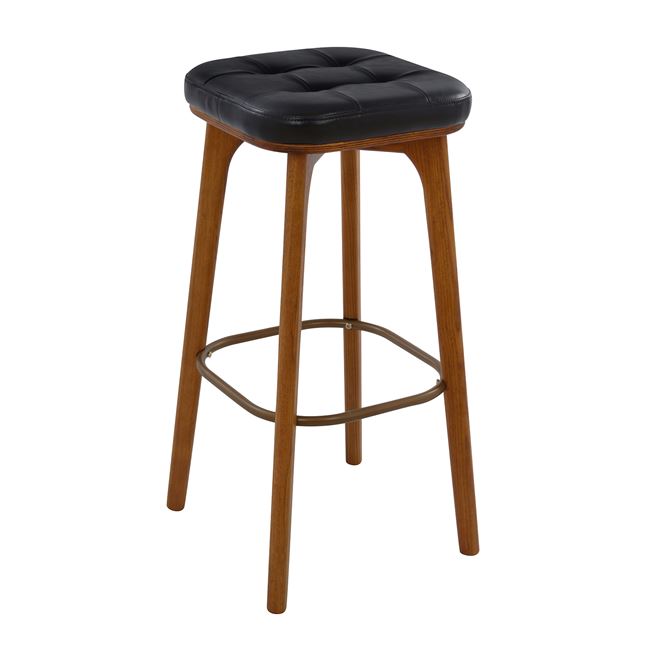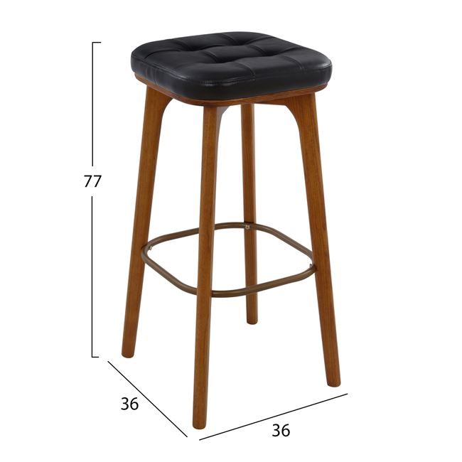 Μοντέρνο αλλά και διαχρονικό σκαμπό κατασκευασμένο από ξύλο σε καρυδί απόχρωση, με μεταλλικό στεφάνι στην ένωση των ποδιών και το κάθισμα του είναι από PU σε μαύρη απόχρωση.Διαστάσεις: 36x36x77 εκ.
